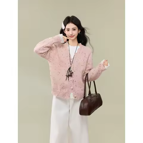 Colorful Mixed Point V-neck Sweater Jacket for Women's Autumn and Winter Design, Pink Knitted Cardigan Top